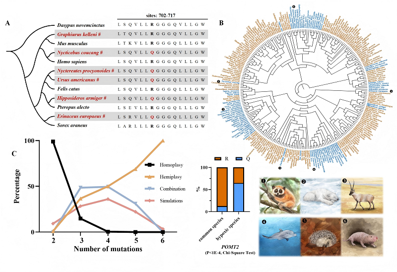 中国科学院昆明动物研究所研究团队,通过对六种冬眠哺乳动物,以及五种非冬眠近缘物种的基因组进行比较,识别出5561个高置信度的直系同源基因。研究运用保守位点收敛和正选择分析方法发现,POMT2基因第708位的精氨酸(R)被谷氨酰胺(Q)替换这一现象可能与冬眠性状相关。在分析的244种哺乳动物里,该变异在多种适应缺氧环境的哺乳动物中普遍存在,频率达65.06%,呈现出强烈的自然选择信号。