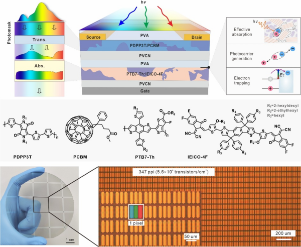 全色域主动适应有机晶体管的器件结构与集成器件照片