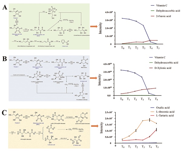 研究团队通过50℃热敷育模拟浓缩刺梨汁胀气过程,并借助UPLC- QTRAP- MS/MS技术对不同时间节点的浓缩刺梨汁样品进行检测,共鉴定出生物碱、黄酮、氨基酸及衍生物等12类2242种代谢物。同时,研究团队通过多元统计分析,将目标锁定在刺梨的维生素C这一成分。结果显示,在浓缩刺梨汁胀气过程中,高含量的维生素C及其手性异构体异抗坏血酸持续下降,直至完全耗尽,而所产生气体中,CO2浓度呈阶梯式同步上升。这两条线索提示,维生素C及其手性异构体的大量降解可能是驱动浓缩刺梨汁胀气的原因。
