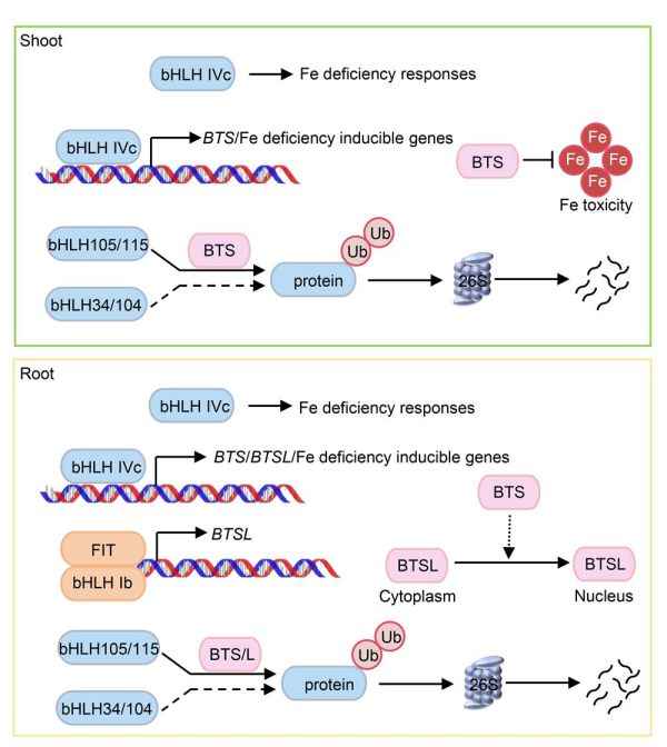 研究发现,BTSL1/2基因主要在根中表达,而BTS基因则在整个植株中表达。尽管二者的突变均可以导致植株积累铁,但只有BTS负责缓解植物地上部的铁毒害。BTS位于细胞核,而BTSL1/2位于细胞质;BTS可以促进BTSL1/2在细胞核定位。BTSL1/2能促进bHLH IVc亚族蛋白的泛素化降解,但这种泛素化降解只发生在根部。四个bHLH IVc基因全部缺失时,缺铁诱导基因的表达在拟南芥根和地上部均不再响应缺铁,表明bHLH IVc是植物全局铁稳态的核心调控因子。BTS和BTSL1/2调控铁信号的功能依赖于bHLH IVc蛋白。bHLH IVc与BTS/BTSL1/2形成反馈调控回路:BTS与BTSL1/2促进bHLH IVc蛋白的泛素化降解,而bHLH IVc激活BTS和BTSL1/2的转录。