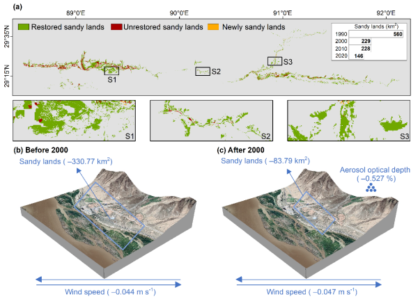 研究发现,自1990年国家启动规模化“一江两河”“退耕还林”“西藏生态安全屏障保护与建设工程”“两江四河”等生态工程以来,雅鲁藏布江中游的荒漠化蔓延趋势被成功遏制。河岸沙化土地恢复率显著提升至59%,人工林覆盖面积实现了从133.85平方公里到419.54平方公里的跨越式增长,增幅高达213%。在全球持续变暖的背景下,自2000年起,国家持续投入的生态建设开始显现深度气候调节效应,表现为地表温度平均降低2.64℃,近地表气温下降0.3℃,土壤含水量提升2.74%,空气湿度增加2.18%。