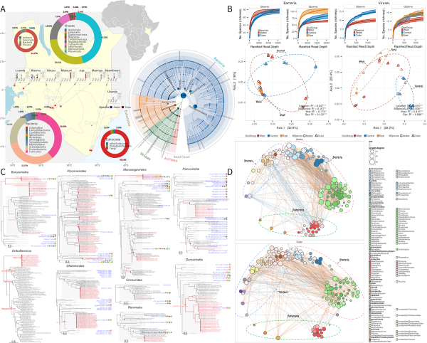 团队利用宏转录组学技术,对2019年至2023年间采集自肯尼亚8个生态区的伊蚊与库蚊样本,结合多维度统计建模及共现网络分析,发现肯尼亚蚊虫微生物组呈现以下特征:病毒在数量上占据优势,而细菌则具有更高的种类多样性。