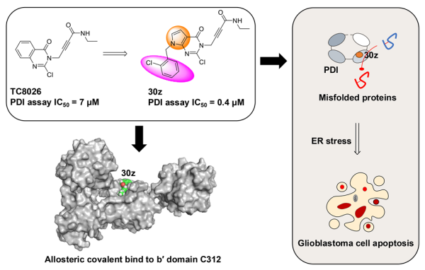 近日,中国科学院遗传与发育生物学研究所通过高通量筛选,从药物样化合物库中发现了PDI抑制剂先导化合物TC8026。团队以其为基础进行系统的药物化学优化,构建了一类以pyrrolo[2,3-d]pyrimidin-4-one为核心骨架的新型抑制剂系列,其抑制活性相较先导化合物最高提升约20倍。代表性化合物30w、30z、30aa和30ab在体外表现出强效的PDI抑制能力,并在多种胶质母细胞瘤细胞中显著诱导内质网应激和细胞凋亡。其中,化合物30z在U251异种移植瘤小鼠模型中显著抑制肿瘤生长,显示出良好的体内抗肿瘤效果。
