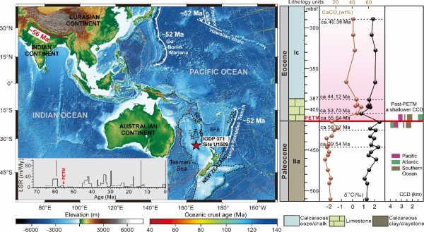 研究团队利用国际大洋发现计划371航次在Zealandia地区获取的深海岩芯,发现约5560万年前沉积环境发生了剧烈转变。沉积物由硅质黏土迅速转变为以碳酸盐为主,并在之后长期保持稳定。值得注意的是,这一变化发生在全球古新世—始新世极热事件期间,当时全球海洋发生酸化不利于碳酸盐沉积。与全球趋势相反的沉积响应,结合沉积速率显著降低等证据,指示该区域很可能经历了一次构造抬升,从而减少了陆源输入并彻底改变了区域沉积环境。