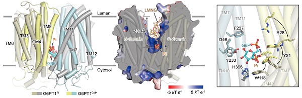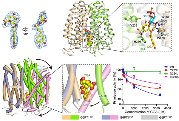 肝脏葡萄糖输出在维持机体血糖稳态的精密调节网络中具有重要作用。葡萄糖-6-磷酸(G6P)作为糖原分解与糖异生途径的共同终末产物,其向内质网腔的跨膜转运,是肝脏释放葡萄糖至血液循环的限速步骤。介导这一关键转运任务的功能蛋白,为内质网膜上的葡萄糖-6-磷酸转运蛋白1(G6PT1)。G6PT1的功能完整性至关重要:其功能丧失会引发严重的常染色体隐性遗传代谢病——Ib型糖原贮积症,患者临床表现为危及生命的低血糖、肝肿大及中性粒细胞功能障碍;与之相对,在2型糖尿病中,适度且可逆地抑制G6PT1活性,可有效降低肝脏过度的葡萄糖输出,因而成为调控血糖的潜在有效治疗策略。研究证实,天然化合物绿原酸(CGA)可抑制G6PT1,且在临床实验中被证实能有效降低2型糖尿病患者的血糖水平,因此被视为前景广阔的潜在抗糖尿病药物。尽管G6PT1生理与病理意义重大,但学界对其底物识别机制、磷酸耦合驱动G6P转运的分子路径、蛋白构象的动态变化规律,以及CGA实现特异性抑制的作用机制等问题尚不明晰。