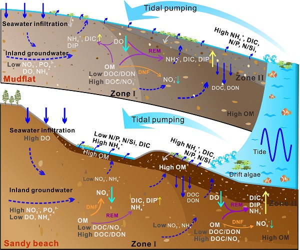 这些结果表明,潮间带沉积物的垂向分层结构是调控地下水中营养盐与碳向海输送组成和通量的关键因素,并提示通过调控沉积结构,有望增强潮滩对陆源营养盐的自然净化功能。
