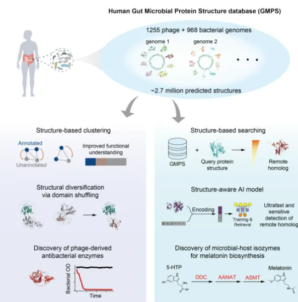 研究团队构建了人体肠道微生物蛋白质结构组数据库。数据库涵盖968个肠道细菌和1255个噬菌体基因组,约270万个蛋白结构,为系统解析肠道微生物功能提供“结构底图”。