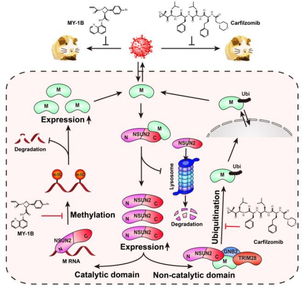 除RNA修饰功能外,NSUN2还通过其非催化结构域,参与病毒蛋白的翻译后调控。作为分子支架,NSUN2可招募泛素接头蛋白GNB2,并进一步促进E3泛素连接酶TRIM28与病毒M蛋白形成复合物,驱动其发生特定类型的泛素化修饰。这一泛素化过程对M蛋白的细胞内转运和功能发挥具有重要影响,从而在蛋白层面进一步支持病毒复制。由此,NSUN2通过催化与非催化结构域的分工协作,在RNA甲基化与蛋白泛素化两个层面,形成一套相互衔接的调控机制:一方面稳定病毒RNA,保障关键蛋白的持续表达;另一方面调控核心病毒蛋白的功能状态,共同推动尼帕病毒在宿主细胞内高效复制。