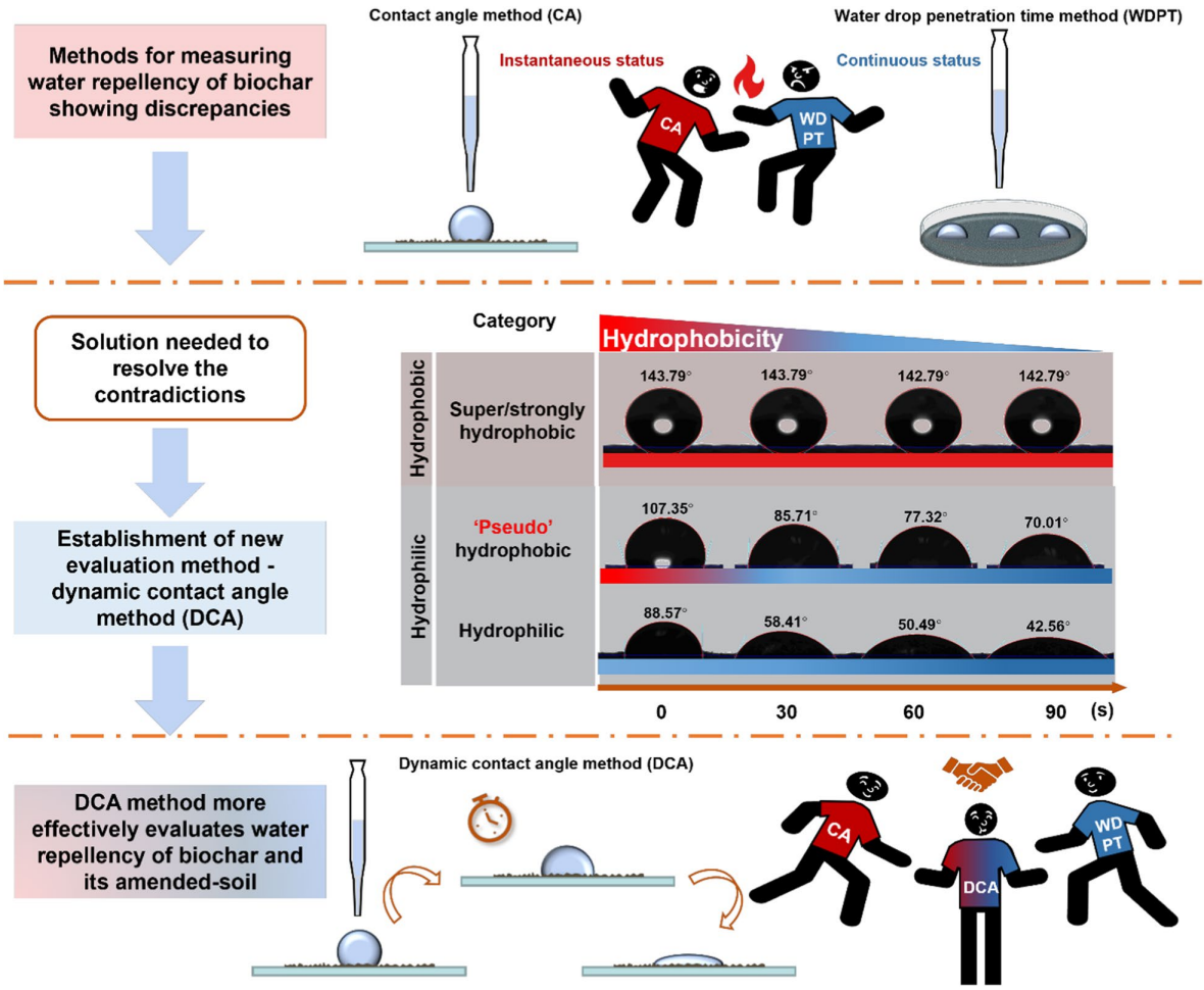 中国科学院新疆生态与地理研究所研究团队,通过17种标准材料和18种生物炭的系统测试,提出动态接触角(DCA)法,追踪90秒内接触角变化,并引入假性疏水概念,从概念上整合了瞬时疏水与持续疏水特征,克服了传统方法的局限性,为干旱半干旱地区生物炭改良土壤的水分管理和环境应用提供了更精准的评价工具。