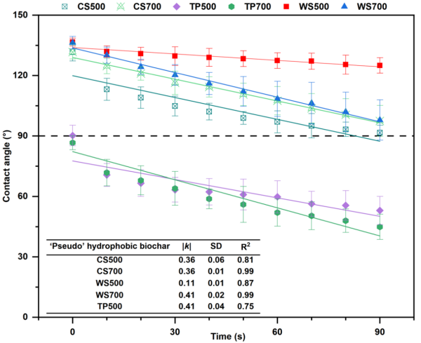 研究建立了包含超疏水、强疏水、假性疏水和亲水的四类疏水性评价新分类标准,并将DCA法和新的评价标准引入土壤疏水性评价中。土壤孵育实验结果表明,生物炭对土壤疏水性的调控具有剂量效应和时间效应。生物炭添加虽可明显提升土壤疏水性,但90天后疏水性强度均有下降,调控的持久性值得后续研究进一步关注。