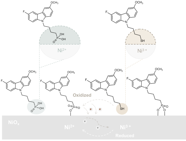 团队设计并合成了一种新型自组装分子4-(3-氟-6-甲氧基-9H-咔唑-9-基)丁烷-1-硫醇(MeOF-4SHCz),并将其用于靶向修饰氧化镍基底表面的Ni3+富集区域。借助硫醇基团的还原性,MeOF-4SHCz可有效还原NiOx基底表面的Ni3+,形成新的S-O-Ni键,并与经典的P-O-Ni键协同锚定,提高了自组装层在NiOx表面的整体覆盖率。