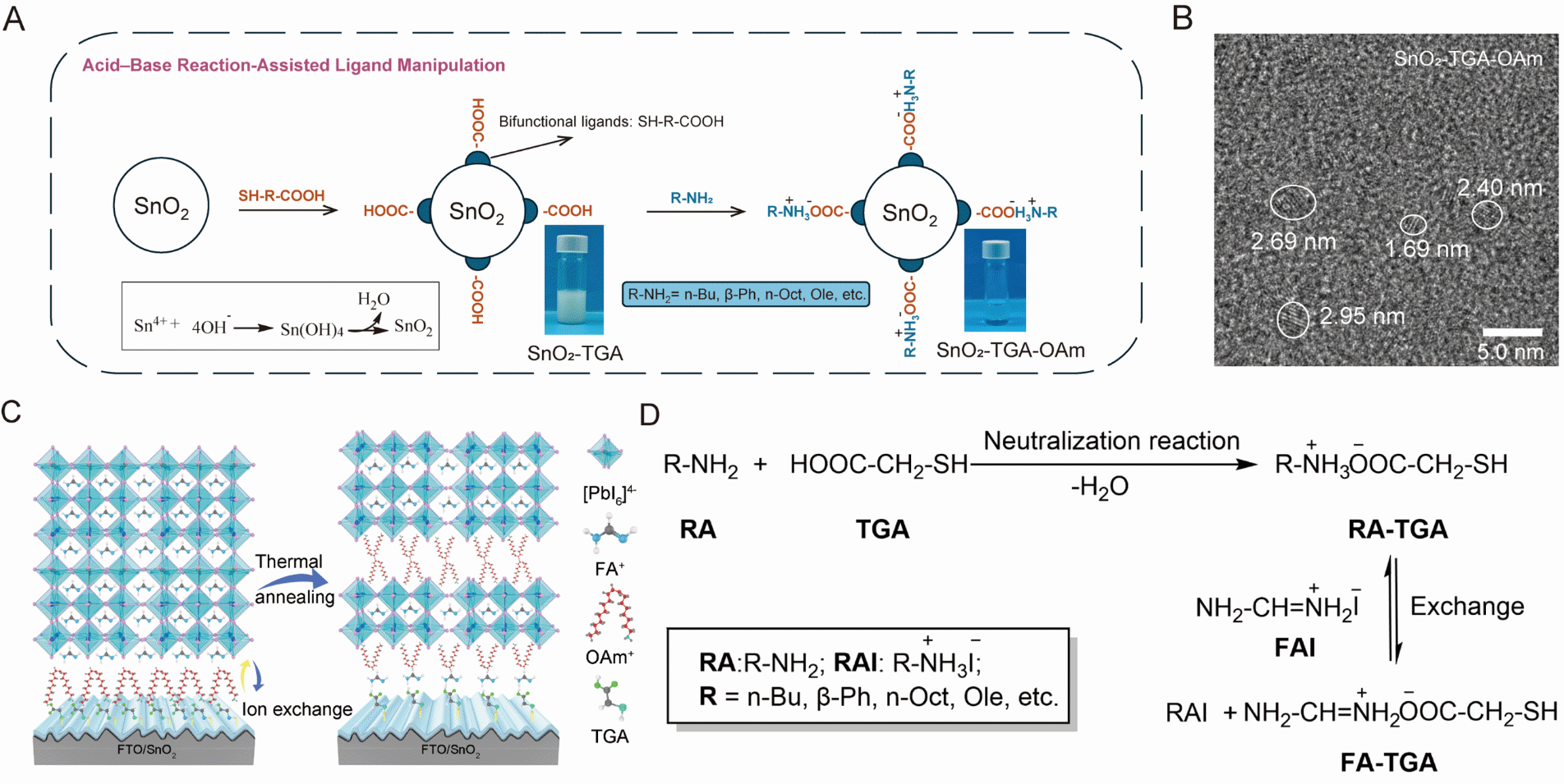 研究团队依次将巯基乙酸(TGA)和油胺(OAm)接枝到二氧化锡纳米颗粒表面(SnO2–TGA–OAm)。TGA与OAm之间的强化学键,确保了油胺配体仅在钙钛矿薄膜的热退火过程中,才与甲脒氢碘酸盐(FAI)的阳离子发生交换。这一受控反应最终在钙钛矿薄膜底部界面处实现原位构建2D/3D钙钛矿结构。