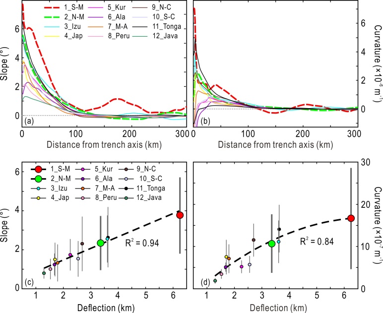 马里亚纳海沟南部与北部,及全球海沟的坡度和曲率对比图