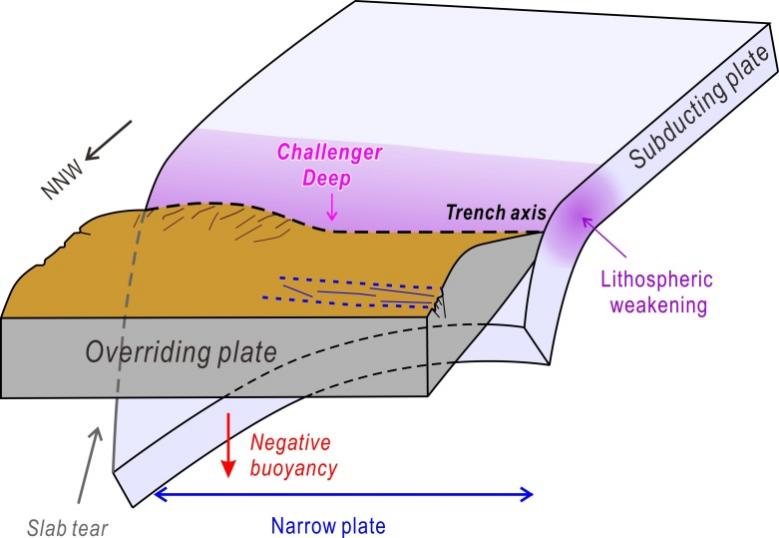 三维数值模拟表明,俯冲板块沿走向的几何分段效应会明显放大局部弯曲。南马里亚纳地区存在的板块撕裂结构,限制了俯冲板块的横向连续性,削弱了沿走向的力学耦合,使弯曲变形在“挑战者深渊”区域集中发展。研究进一步指出,正是“岩石圈弱化—负浮力驱动—板块撕裂分段”三种机制的协同作用,共同造就了这一全球极端深度。
