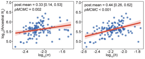 120种鸣禽长期有效种群大小(Ne)与遗传多样性之间的关系