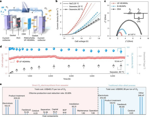 技术经济分析表明,该体系相较传统氯碱工艺可显著降低32.8%的总生产成本,其中高熵合金电极促使电力消耗降低超50%,海水替代高纯盐水使原料成本降低超80%。