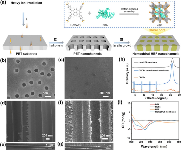 近日,中国科学院近代物理研究所等在手性分离膜研究方面取得进展。研究团队依托兰州重离子加速器(HIRFL)提供的重离子辐照技术,成功制备出一种具有同手性特征的氢键生物杂化框架核孔膜(HBF@PET),实现了对氨基酸对映体的高效、精准分离。