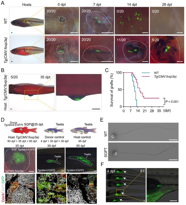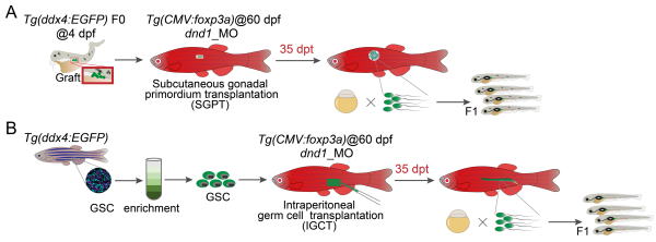 近日,团队通过构建foxp3a转基因斑马鱼,成功建立了鱼类iTreg介导的免疫耐受技术,突破了异体性腺原基皮下移植(SGPT)和生殖干细胞腹腔移植(IGCT)的免疫排斥障碍,加速了供体配子的产生和品系构建。