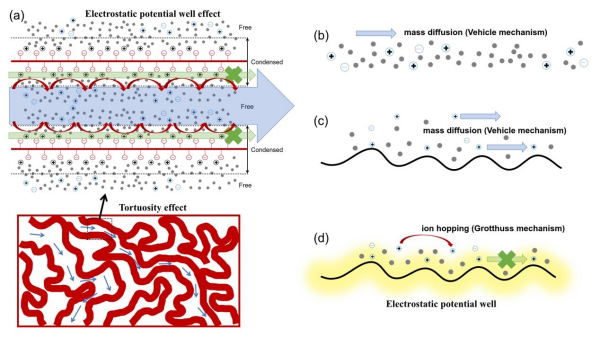 实验与理论分析表明,膜导电性并非膜材料的固有属性,而是膜—离子—溶液体系的综合特性,受反离子水合性质、聚合物网络拓扑、电荷密度及溶液浓度多重因素调控。弱水合反离子(如K⁺、Rb⁺、Cs⁺)在静电势阱作用下输运加速更显著,而适度的水含量与电荷密度更有利于实现高速离子输运。