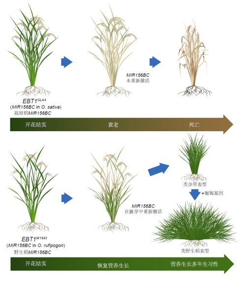 miR156是植物的“年龄开关”。传统认为,它在植物幼苗期高表达,长大后慢慢减少,促使植物从长叶转向开花结果。但新研究发现,野生稻的MIR156B和MIR156C在开花后重新被激活,让腋芽逆转发育,恢复生长,不断长出新的分枝,实现无性繁殖。这个独特的现象与野生稻EBT1基因座位的表观修饰状态密切相关。