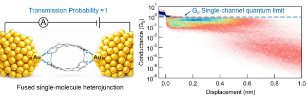 在纳米与亚纳米尺度电子器件中,电极与导电沟道之间的接触界面通常决定器件性能的上限。对于单分子结这类极限尺寸器件,金属—分子—金属界面属于典型的异质界面,电极与分子之间的能级与轨道失配会引发电子背散射,使器件电导远低于量子电导极限G0=2e2/h。因此,如何抑制界面散射并实现接近理论极限的量子输运是分子电子学领域的重要挑战。