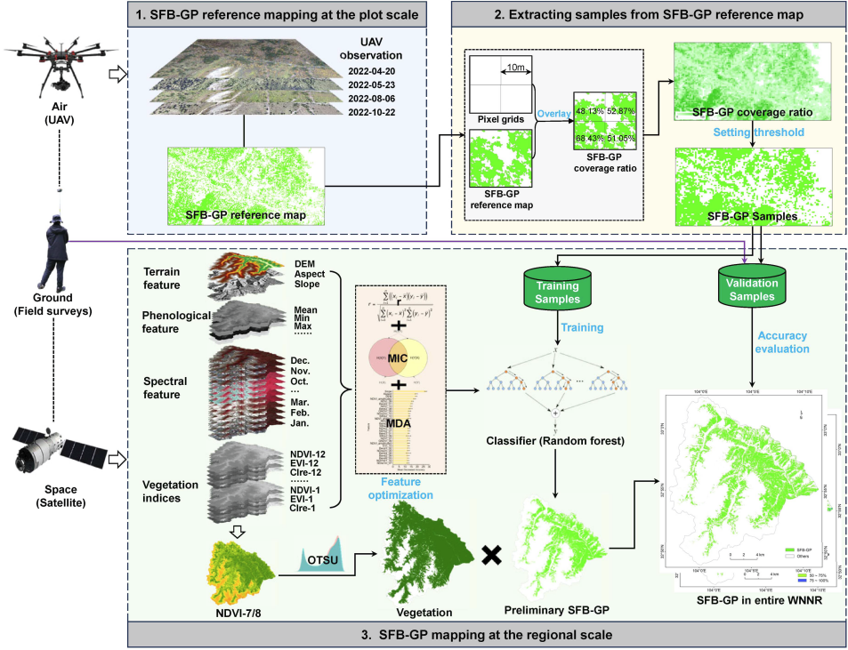 近期,中国科学院成都山地灾害与环境研究所研究团队依托野外科学观测研究站,构建了空天地一体化观测体系,在大熊猫国家公园植被光合生理监测与主食竹空间分布制图方面取得新进展。