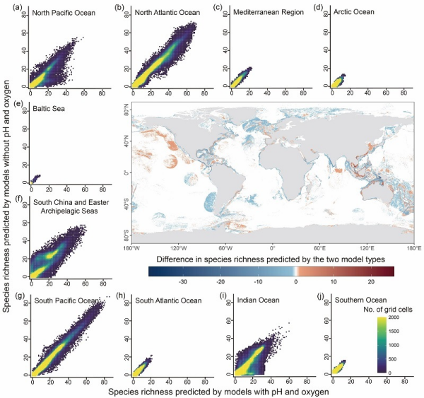 研究发现,两类物种分布模型预测的适宜分布区范围大小存在差异,表明酸化和缺氧对冷水珊瑚分布具有约束效应。在全球尺度上,两类物种分布模型对物种丰富度的预测结果呈现出高度相关性,然而在约三分之一的地区,其空间分布格局存在显著差异。