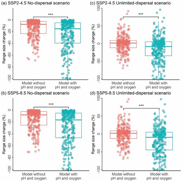 在中等社会经济发展路径(SSP2-4.5)与高碳排放、高经济增长路径(SSP5-8.5)下,无论假设物种无扩散能力还是无限扩散能力,纳入pH与溶解氧因子的物种分布模型均一致预测:冷水珊瑚的分布范围将出现更大幅度的缩减。总体而言,相较于未考虑这两个因子的模型,纳入pH与溶解氧的模型所预测的气候变化导致的分布范围损失平均高出16.8%。