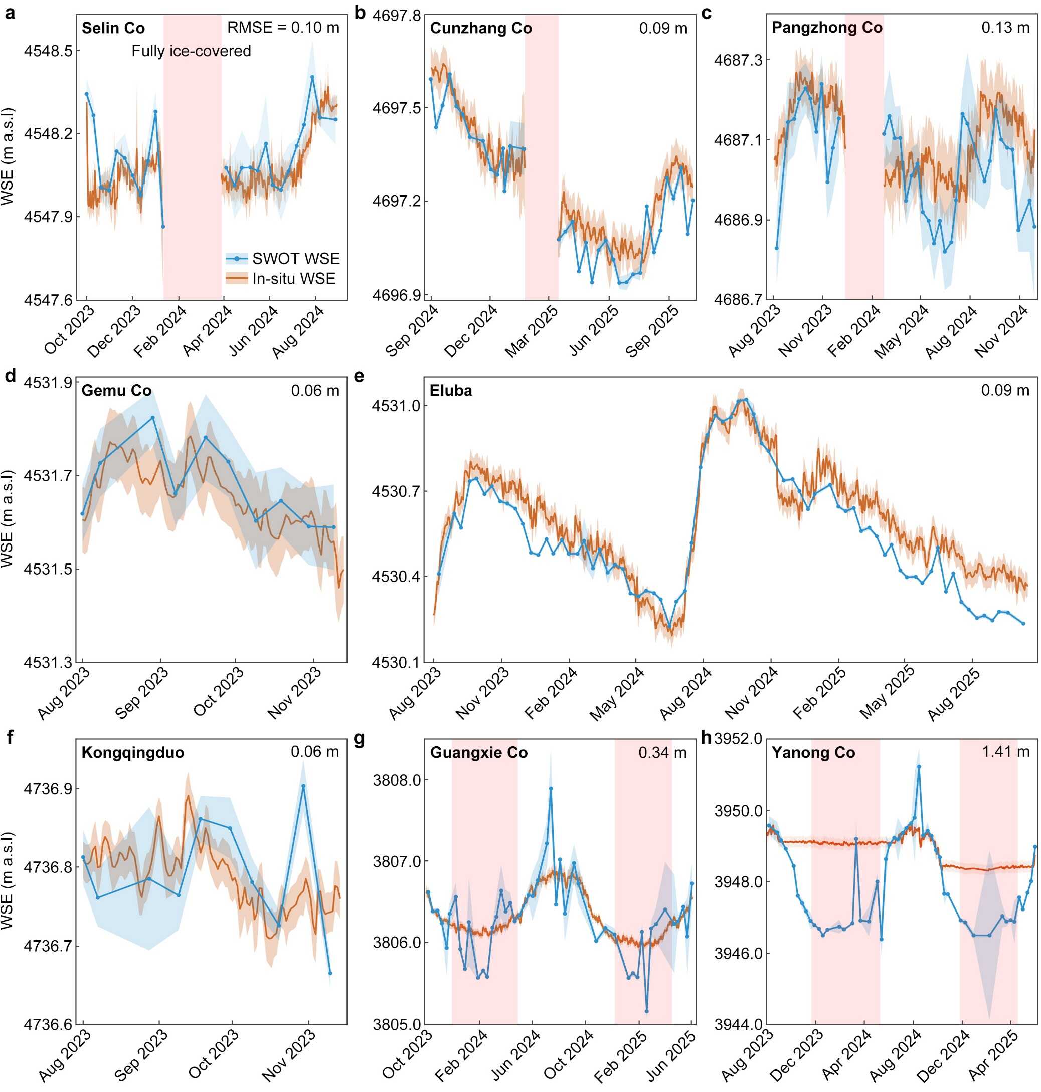 针对上述问题,中国科学院青藏高原研究所等研究团队,发展了一种针对SWOT卫星的水位提取新算法,并结合青藏高原9个湖泊的多年野外观测数据进行验证。该方法基于SWOT卫星最新发布的D版本L2级高码率PIXC数据,通过先验湖泊边界约束下的高斯核密度估计,有效规避了复杂地形干扰,实现了对青藏高原中—小型湖泊水位的高精度提取,证明了SWOT卫星具备在复杂地形下进行湖泊水位监测的能力。在青藏高原的验证湖泊中,提取水位的平均线性相关系数达0.72,均方根误差为0.29m。研究进一步表明,在冰湖水位监测应用中,为提升数据可用性,数据处理应重点关注相位解缠绕、信噪比、相干增益等反映传感器状态的标签。由于湖泊水体与陆地间存在显著的后向散射差异,叠掩效应对湖泊水位监测精度未产生明显影响。