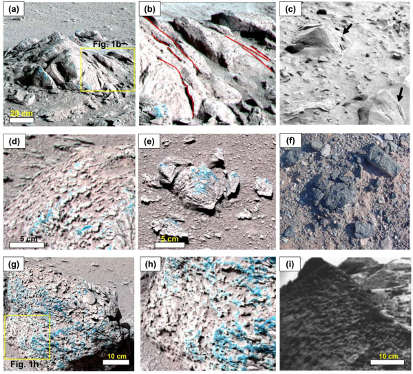 近日,中国科学院国家空间科学中心和中国科学技术大学等,基于祝融号火星车的原位观测数据展开系统研究。研究团队在沿途的岩石表面识别出近平行的片状剥落、彼此嵌合的碎裂块体及密集分布的凹坑,这些形态特征与地球上的盐风化产物相似。