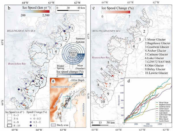 中国科学院西北生态环境资源研究院研究团队,基于2015年至2025年的Sentinel-1卫星观测数据,系统分析了南极半岛Beascochea海湾101条冰川流速变化特征,揭示了该区域上层海水变暖对冰川加速流动的关键作用。研究发现,十年间海湾冰川夏季平均流速增幅达1.81±0.65%,较冬季均值高出约0.88%;自2018年起,冰川流动出现大范围加速,最高年增速达4.04±0.50%yr-1。模型分析表明,0–300m深度的上层海洋变暖是主导因素,持续的流速加快与海洋次表层浅部热量输入密切相关。