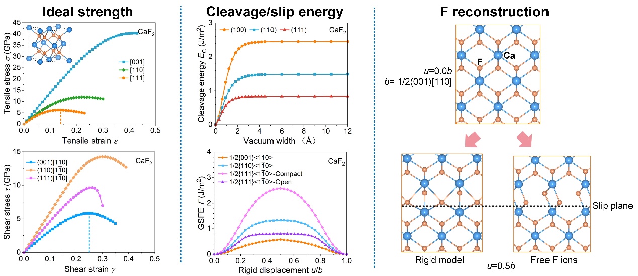 针对上述问题,中国科学院上海硅酸盐研究所研究团队通过理论计算,揭示了萤石结构碱土金属氟化物晶体脆性的各向异性与初始塑性变形的微观机制,构建了基于滑移面原子键合的解理—滑移竞争统一理论框架,阐明了长期制约该类光学材料工程应用的脆性失效机理。