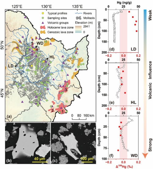 近期,中国科学院南京地理与湖泊研究所等研究团队,以黑龙江省与吉林省黑土区为研究对象,综合运用显微矿物学、地球化学及土壤学等方法,系统捕捉了火山灰在黑土形成过程中的地球化学与矿物学印记。研究结果显示,在邻近五大连池火山区的黑土中发现少量火山玻璃,其元素组成与附近老黑山火山喷发产物一致,从矿物学角度证实了火山灰参与区域局部黑土的成土过程。汞元素含量及其同位素(Δ199Hg)分析进一步显示,远离火山的土壤剖面未受到火山灰影响,而靠近死火山和活火山的土壤剖面均存在明显的火山灰输入信号。