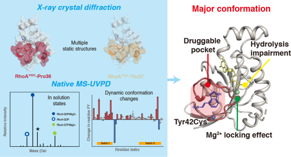 近日,中国科学院大连化学物理研究所研究团队联合中国科学院上海药物研究所研究团队,将X射线晶体学、非变性质谱(nMS)、193nm极紫外光解离(UVPD)技术有机结合,系统解析了胃癌相关RhoA Y42C突变体中难以捕捉的动态构象特征,并在此基础上筛选出针对该突变体的共价抑制剂。
