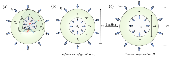 在页岩油气等非常规能源开发过程中,深部储层孔隙长期处于初始应力、温度变化及内外压力共同作用之下,孔隙体积及应力状态会随多场耦合环境的改变不断变化。由于球形孔隙是描述多孔介质孔隙演化的常用理想化模型,含初始应力受压球壳的大变形问题也成为连续介质力学中的经典课题,在压力容器、微胶囊等工程场景中同样具有广泛应用。虽然现有研究已分别讨论了压力—膨胀、温度效应或初始应力的影响,但同时考虑内压、外压、温度和初始应力的解析理论仍较为缺乏。
