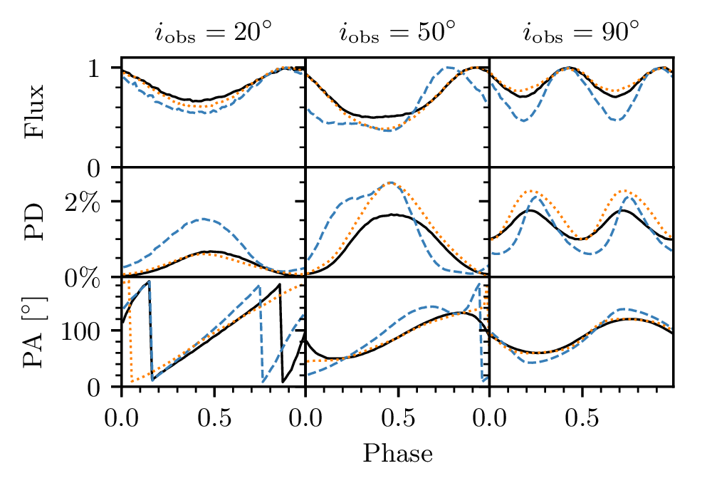 研究团队基于广义相对论光线追踪方法,模拟计算快速旋转中子星表面热斑所产生的周期性脉冲轮廓,所得结果与其他团队历经二十余年建立的多项检验标准高度一致。同时,研究团队构建了理论模型及配套数值计算程序——MONK-NS。该程序集成了广义相对论框架下的三维光线追踪与辐射转移过程,并具备内置X射线偏振辐射计算能力。依托上述功能,研究团队首次揭示了不同热斑几何构型对应迥异的X射线偏振辐射特征,并提出了脉冲信号偏振辐射的模型检验判据。