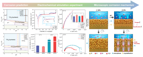 研究阐明了静水压力对钛钝化膜演化的双重调控效应。在钝化初期,高压环境会促进氧元素向钝化膜内部扩散,加速膜层生长并提升钝化膜稳定性,增强钝化膜的初期防护能力;在长期高压服役或膜层破损修复阶段,高压会诱导原本非晶态的钝化膜发生局部晶化,形成亚稳TiO晶相,产生的晶界形成离子渗透通道,削弱钝化膜的自修复能力,导致膜层阻隔性能降低。该研究厘清了钝化膜“非晶—晶态”结构转变与耐蚀性能衰减的核心机制,明确了钝化膜中氧含量、晶相结构是调控深海钛材耐蚀性的关键因素。