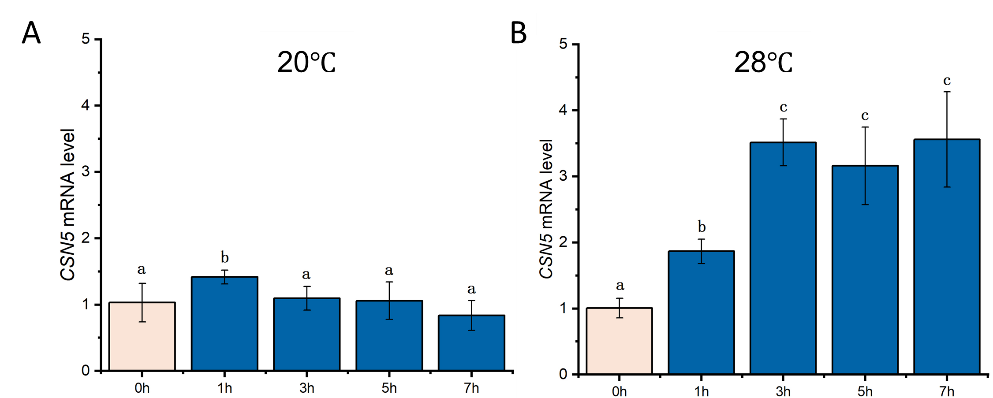 研究团队基于TaraOcean宏转录组数据分析发现,CSN5同源基因广泛分布于全球海洋浮游藻类中,且其转录丰度随环境温度升高而增加,表明CSN5可能参与海洋浮游藻类对升温环境的适应过程。进一步研究显示,CSN5在28℃高温处理后被迅速诱导表达,表现出显著的温度响应特征。
