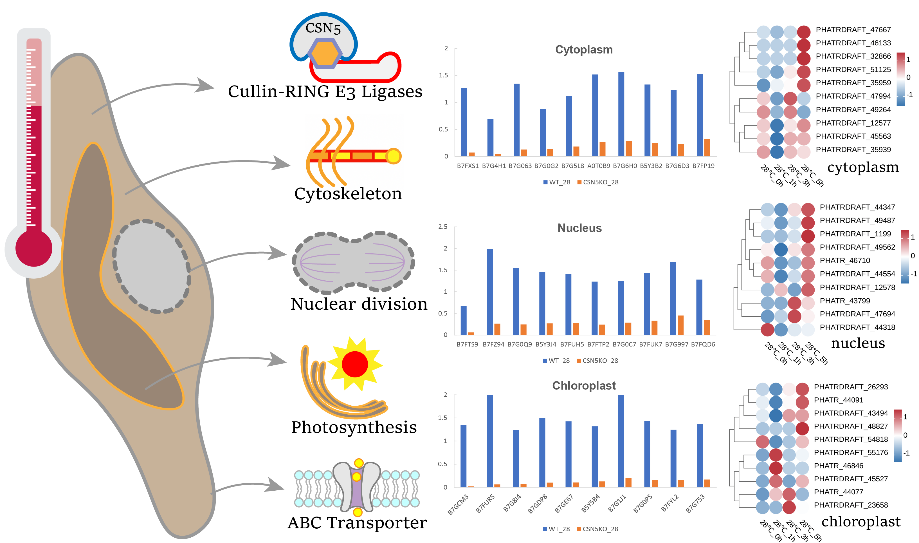定量蛋白质组学分析与表型观察显示,在高温条件下,CSN5基因敲除会引发三角褐指藻的蛋白表达重塑,干扰光合系统、蛋白降解及细胞骨架相关过程,破坏细胞稳态与形态。研究提出,CSN5介导海洋硅藻高温适应的工作模型。CSN5通过调控蛋白周转、光合作用、细胞分裂、膜转运和形态稳态,提升三角褐指藻对高温环境的适应能力。