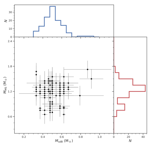 双星系统中热亚矮星与主序伴星的质量分布,热亚矮星质量集中于0.5M⊙附近,而主序伴星质量范围较宽。