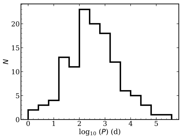 通过蒙特卡洛方法统计推断的轨道周期分布,系统周期主要集中在数十天至数千天的长周期区间。