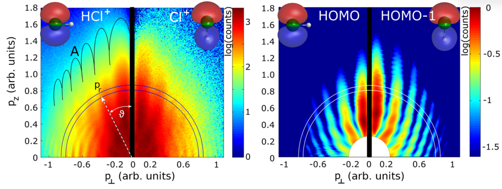 研究团队结合高分辨电子—离子符合测量技术,以及自主发展的强场量子轨道理论模型(CQSFA),分离出了来自HCl的不同分子轨道的光电子全息信号,建立了异核分子轨道结构与光电子全息图样之间的直接对应关系,实现了光电子全息从整体信号观测迈向轨道分辨测量的跃升。