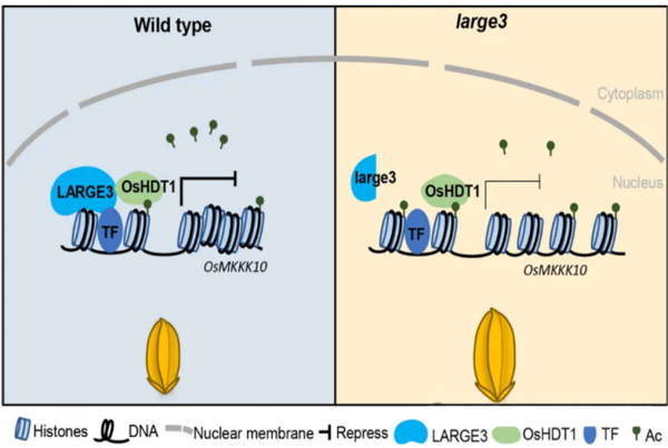 进一步研究发现LARGE3与组蛋白去乙酰化酶OsHDT1互作,通过影响水稻组蛋白H4乙酰化水平负调控籽粒长度。LARGE3与OsHDT1的复合体可结合OsMKKK10启动子区域,并通过降低该位点的组蛋白H4乙酰化水平,增加核小体密度,使染色质处于紧密状态,从而抑制该基因表达。