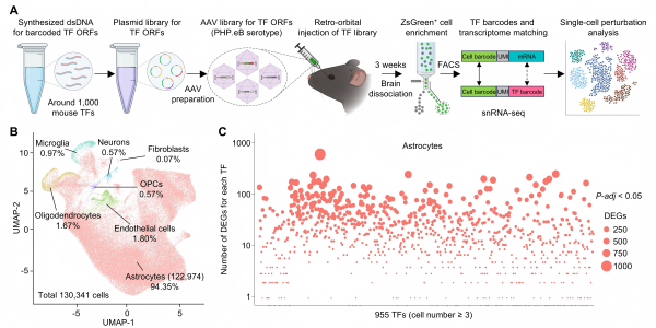 此后研究以携带星形胶质细胞特异性启动子的腺相关病毒为载体,制作“智能快递员”,把近1000个转录因子的“指令包”,分别精确地送到小鼠的星形胶质细胞中,让每个细胞的状态和它收到的“指令包”精准关联。