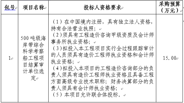 一、招标项目名称:500吨级海岸带综合科学考察船工程项目结算审计单位选定