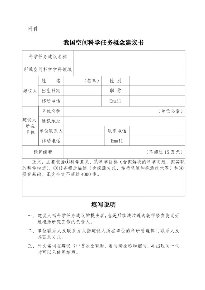 本次征集的科学任务建议须满足以下要求:(一)是我国科学家自主提出的原创性科学构想;(二)应属于空间科学的主要学科领域范围:空间天文、太阳物理、空间物理、行星科学、空间地球科学、微重力科学、空间基础物理和空间生命科学。