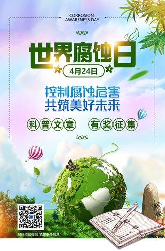 今年的4月24日是第12个“世界腐蚀日Corrosion Awareness Day”。我国每年为腐蚀付出的代价相当于GDP的3%-5%。腐蚀不仅污染环境、消耗资源,还会影响人类健康,各类腐蚀控制技术的应用是保障重大工程实施、降低腐蚀损失和节约资源的重要手段。为提升公众对腐蚀和腐蚀控制的认识和了解,科学普及材料腐蚀学科在经济和生活中的重要作用,保护国家财产和人民生活安全,中国科学院沈阳分院、(联合国)世界腐蚀组织(WCO)中国办公室、国家金属腐蚀控制工程技术研究中心、广东腐蚀科学与技术创新研究院联合面向社会公众、各行各业腐蚀与防护科研及技术工作者征集科普文章。