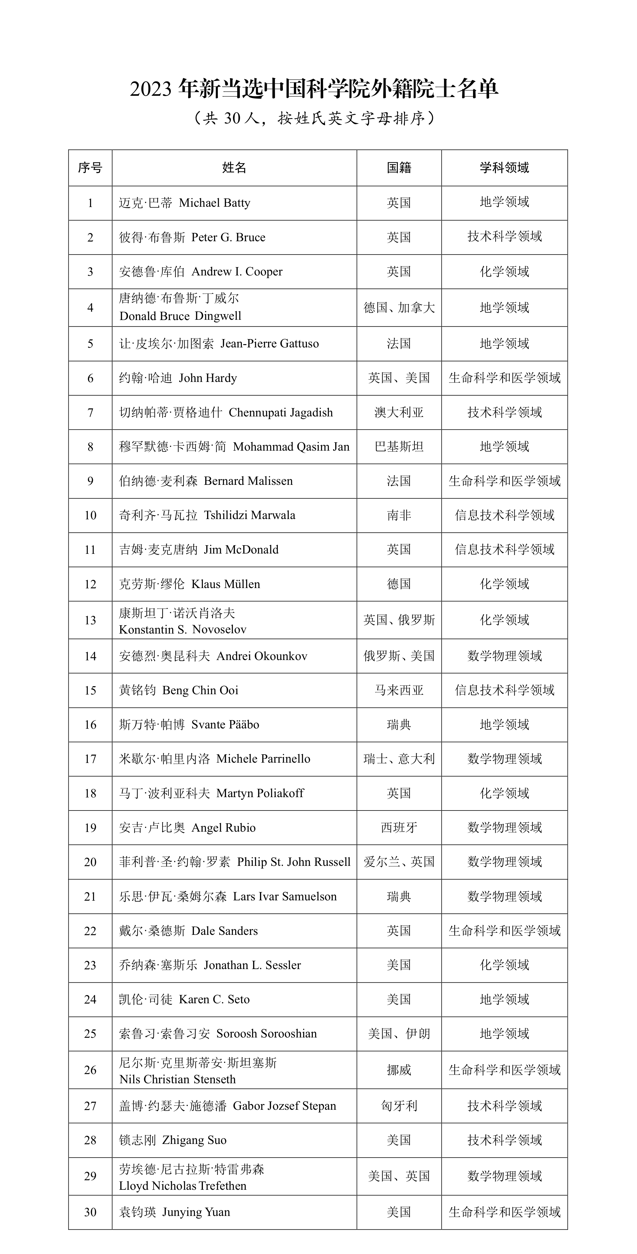 根据《中国科学院院士章程》《中国科学院外籍院士选举办法》等规定,2023年中国科学院选举产生了30名中国科学院外籍院士。