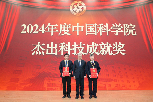 侯建国为获得2024年度中国科学院杰出科技成就奖个人成就奖的陈立泉院士、陈仙辉院士颁奖