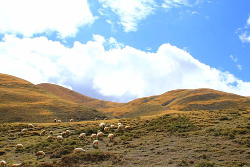 遥望——雪山是白色的,白色是圣洁的色彩,表达和象征人的真诚、纯净的心愿,所以哈达是白色的。在山间、在佛堂、在树上、在藏家人的房前屋后,哈达缭绕,舞动在天空和原野,那一朵朵白云如同飘动的哈达,让人为之感动。
